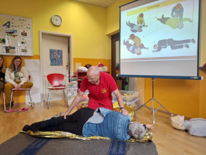 Trotz Feiertag versammelten sich am 01.11. zehn hochmotivierte Mitarbeiter und Erzieherinnen der Nova, Elternpaten aus der Umgebung und eine Tagesmutter aus Birkenheide zur Teilnahme an dem ebenfalls speziellen Erste Hilfe Kurs für Mitarbeiterinnen und Mitarbeiter aus "Bildungs- und Betreuungseinrichtungen für Kinder". Obwohl der Kurs an einem Feiertag stattfand, waren alle mit Eifer und viel Engagement dabei. Die Erzieherinnen der Nova hatten für das Frühstück mit Kaffee, Brötchen, Wurst, Käse und Kuchen und sogar mit Suppe und Würstchen zum Mittagessen für das leiblich Wohl gesorgt und somit erheblich zur guten Stimmung beigetragen.